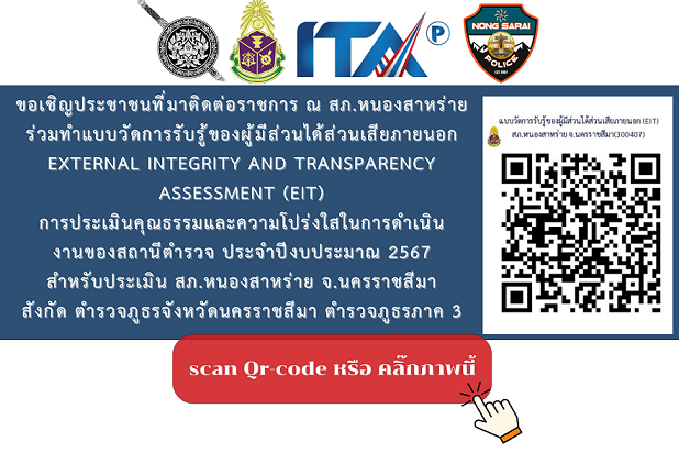สภ.หนองสาหร่าย เชิญชวนร่วมทำแบบวัดการรับรู้ของผู้มีส่วนได้ส่วนเสียภายนอก (EIT) การประเมินคุณธรรมและความโปร่งใสในการดำเนิน งานของสถานีตำรวจ ประจำปีงบประมาณ 2567